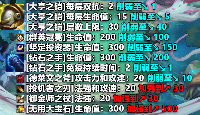 这次的金鳞龙装备几乎是全部进行了调整,目前12.12中比较核心的德莱文之斧和钻石之手都得到了削弱,特别是钻石之手,直接将免伤的时间拦腰砍了一刀,估计在12.13中金鳞龙为主的几套阵容都会受到很大的影响,强度也大不如从前。