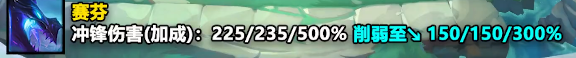 好在新版本他终于迎来了削弱,伤害砍掉了很多,一头进去直接将C位拍死的可能性小了很多,不过他自身提供的控制效果以及坦度并没有受到影响,估计还能见到他,只不过应该不会像现在一样所有阵容都抢赛芬了。