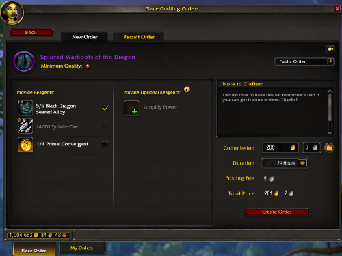 玩家可以通过与拍卖行类似的界面下达订单,几乎所有巨龙群岛的制作配方都可以下单。