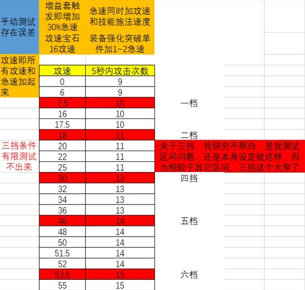 有人提到的攻速档位,其实暗黑老玩家都知道攻速档位的存在,档位简单理解就是,比如你现在每秒攻击2下,你面板加10%攻速但是没到档位,那么你的实际攻击次数还是每秒2下,当你加的攻速超过档位后,不如面板加10.5%的攻速,那么你才能每秒攻击3下。这方面还涉及的帧数,攻击间隔,这些讨论起来太复杂了,所以我的测试就按5秒内普攻的次数,简单明了,而且设备还有游戏装备条件有限(没办法一点一点攻速增加来测试,只能在一定范围内了)。