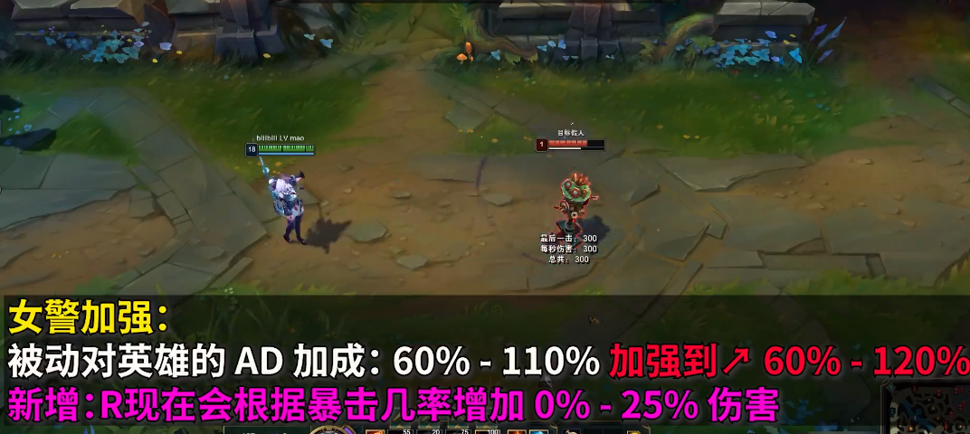 新版本女警进行了幅度不小的加强,毕竟这位ADC确实已经脱离主流AD行列很久了,这次拳头将小蛋糕的被动伤害提升了10%,同时现在的R技能可以受暴击几率的影响,最高增加25%的额外伤害,这样的改动毫无疑问让女警的后期能力有所提升,不会在像之前那般后期疲软。