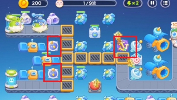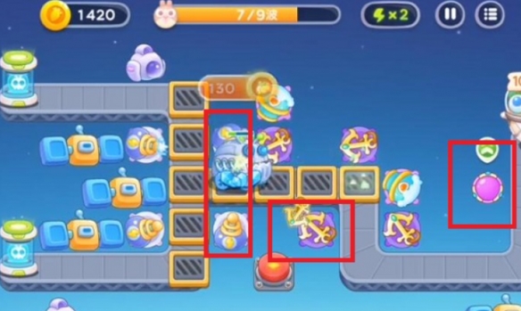 3、第5波在最右边放一个电磁炮,第6-7波在中间放2个闪电塔和船锚。