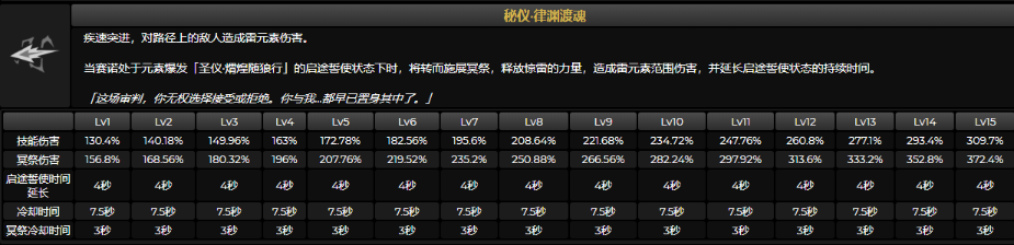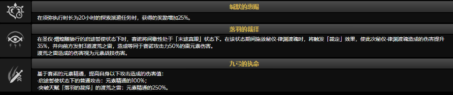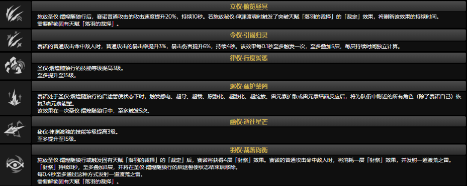 施放圣仪煟煌随狼行后,赛诺普通攻击的攻击速度提升20%,持续10秒。若施放秘仪律渊渡魂时触发了突破天赋「落羽的裁择」的「裁定」效果,将刷新该效果的持续时间。